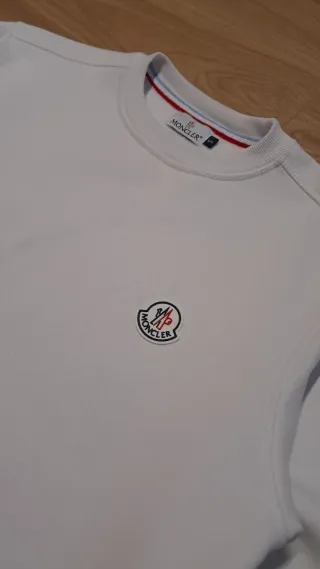 Sudadera Moncler blanca estilo crewneck con logo pequeño bordado en el pecho. Diseño minimalista y muy elegante, fácil de combinar con cualquier outfit. Sin manchas ni desperfectos. Ideal tanto para vestir casual como para looks más arreglados. 100% algodon Talla S