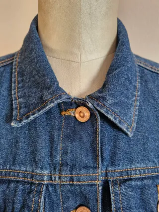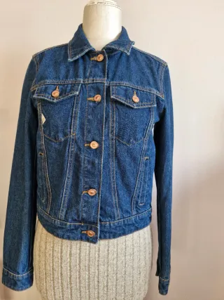 Chaqueta vaquera de estilo clásico con interior de borreguillo ideal para los días de frío. El tejido denim tiene un acabado lavado muy favorecedor y cuenta con cierre de botones metálicos y bolsillos funcionales. Como se puede ver en las fotografías, aunque la etiqueta marca una talla pequeña, está presentada sobre un maniquí de la talla 38, lo que permite apreciar cómo queda el ajuste y el largo de la prenda en una silueta real. Es una pieza muy versátil y abrigada que se mantiene en excelente estado. Look moderno: Con unos vaqueros negros de tiro alto y botas militares. Look clásico: Sobre un vestido de punto o c