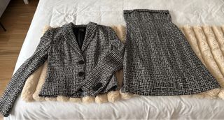Elegante conjunto de chaqueta y falda estilo Chanel, con un diseño tweed clásico. - Chaqueta con botones. - vestido a juego.