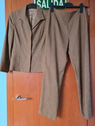 Conjunto de dos piezas formado por chaqueta y pantalón. - Chaqueta con un botón. - Pantalón de corte recto. Traje de dos piezas, la parte de arriba es traje chaqueta tipo blazer y el pantalón de vestir estilo pinza y recto. La parte de arriba tiene botones para abrochar, y el pantalón tiene una cremallera en el lateral de una pierna. Es color marrón tierra. Talla 40. Hecho en España