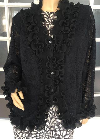 Elegante chaqueta de encaje con detalles de volantes. Es muy bonita y con estilo y te la puedes poner en muchas ocasiones tanto con falda o con pantalón. Poliéster 100%. - Talla 44-46, pero antes de comprar COMPROBAR MEDIDAS: sisa 55 cm, caderas 55 cm, largo 66 cm y hombros 47 cm. Si te gusta el vestido también puedes hacer un lote y podemos llegar a un acuerdo. El vestido es de una buena marca, es de SÍNTESIS y verás más fotos en mi perfil.