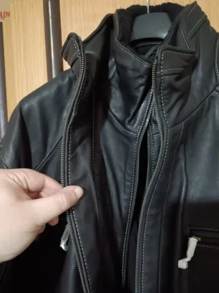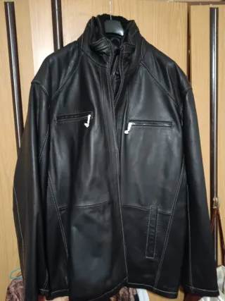 Chaqueta de caballero tipo cuero, ideal para un estilo moderno. Presenta un diseño con costuras blancas que le dan un toque distintivo. - Cierre frontal con cremallera. - Bolsillos con cremallera en el pecho. - Bolsillos inferiores. - Cuello alto.