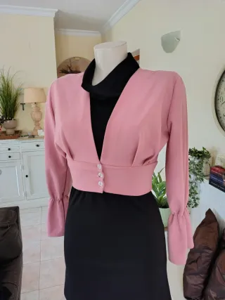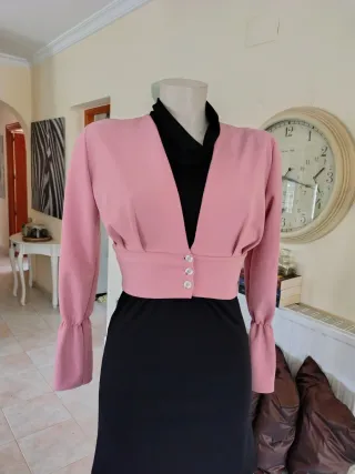 Elegante bolero corta rosa de estilo femenino y sofisticado. Diseño entallado con tres botones decorativos y mangas largas ligeramente acampanadas. Perfecta para combinar con vestidos, looks de fiesta o outfits elegantes. Ideal también para eventos, cenas o estilo chic. ✨ Made in Italy ✨ Talla S ✨ Tejido elástico muy cómodo ✨ 94% poliéster, 6% elastano En muy buen estado.