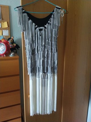 Vestido de Flecos estilo Charlestón años 20 hecho a mano por una modista de bailes de salón. Lleva una base de body de lycra que lo hace super cómodo. Los flecos de abajo quedan muy sexy. Queda muy bonito puesto. Ideal para bailes de salón o Danza. Talla 34-36. Lo vendo porque ya no me vale. Lo usé solo 1 vez para una actuación. También para bodas o eventos. Totalmente artesanal.
