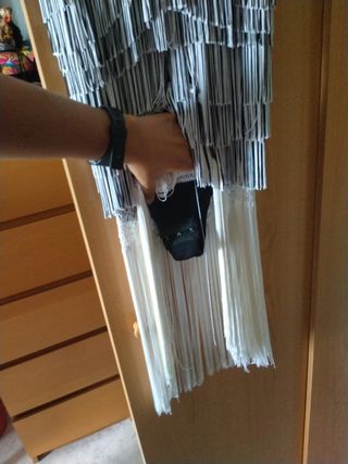 Nuevo Puesto en una ocasión Mangas semitransparente y con goma en la muñeca. Con volantes estilo charleston. Precioso y elegante. Es una M, pero da talla. Lleva forro por dentro. Medidas: 43 ancho de hombros x 90cm de altura.