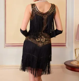 Vestido corto con un estilo inspirado en la época del Charleston, perfecto para eventos temáticos o noches de cabaret. Su diseño con flecos le da un movimiento espectacular. - Diseño sin mangas. - Falda con múltiples capas de flecos. - Escote redondo. La talla va de S a L sin problema.