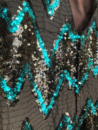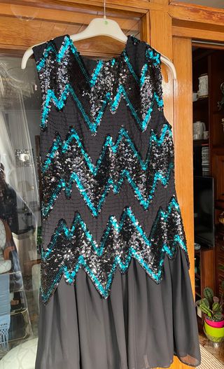 Vestido corto con un diseño llamativo de lentejuelas. Hecho en modista, con buen tejido. Tiene mangas largas opcionales, que se pueden montar o desmontar al gusto. La talla equivale a una 38/40. Su estilo recuerda al "Charlestone". Ha sido utilizado solo en dos ocasiones. - Cuerpo del vestido cubierto de lentejuelas. - Detalle de lentejuelas en zig-zag. - Falda con vuelo de tela ligera.