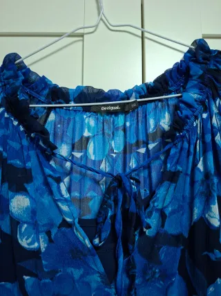 Vestido de la marca Desigual con un estampado floral vibrante en tonos azules y negros. Su diseño es ligero y con vuelo, ideal para un estilo bohemio. - Escote en V con cordones. - Mangas largas acampanadas. - Varios volantes en el bajo.