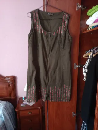 Vestido de la marca Koroshi con un diseño inspirado en el estilo de Desigual. Se ha usado dos ratos. - Color verde oliva. - Cierre de cremallera frontal. - Adornos bordados en el escote y bajo.