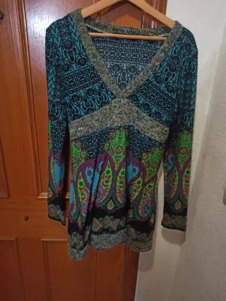 Vestido de manga larga con un estampado vibrante y llamativo. - Diseño con escote en V. - Tejido con detalles de punto. - muy calentito, puesto un par de veces. Hago envío y lotes, no aceptó ofertas, ultimo precio.