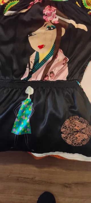 Vestido con un diseño vibrante y original, con un estampado inspirado en el arte asiático. La parte superior presenta una ilustración detallada de una figura femenina con motivos florales y detalles en rosa y azul. La cintura es elástica para un mejor ajuste. - Diseño desigual con silueta fluida. - Tejido satinado con caída. - Estampado multicolor sobre fondo negro.