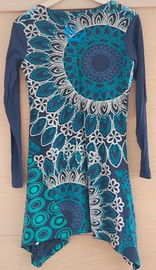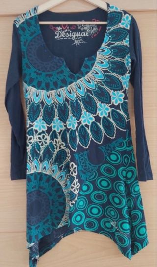 Precioso vestido del estilo Desigual. Es de estilo boho chic, con estampado floral y detalles en tonos teja y turquesa. - Diseño original y alegre. - Corte favorecedor. - Ideal para eventos especiales o para el día a día.Puedes hacer lote con más cosas de mi perfil para ahorrar en gastos de envío. Hago envíos wallapop, correos, GLS, inpost, Seur, UPS. Envíos rápidos.