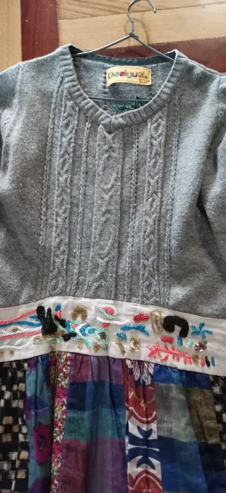 Vestido de la marca Desigual con un diseño único. - Parte superior de punto gris con trenzado. - Cinturón blanco bordado con detalles coloridos. - Falda estilo patchwork con estampados variados.
