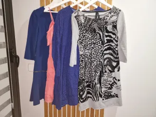 Conjunto de 4 vestidos con distintos estampados y estilos. - Vestido azul marino con cremallera dorada.CORTEFIELD - Vestido coral con estampado, vuelo y manga tirantes.CYA - Vestido azul con estampado de lunares blancos.MANGO - Vestido gris con estampado animal print y texto. DESIGUAL