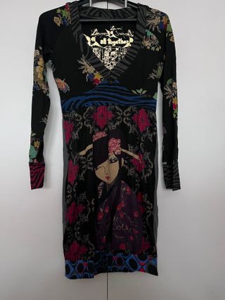 Vestido de la marca Desigual con un diseño llamativo y original. - Combinación de colores negro y multicolor. - Estilo único con detalles bordados y estampados.