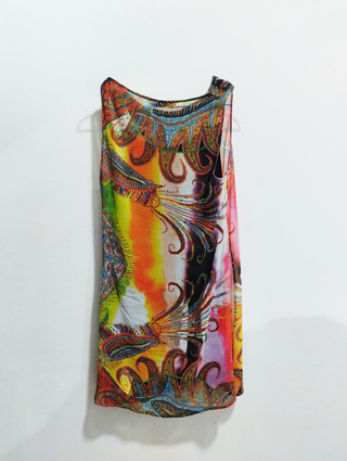 Vestido de verano con un diseño vibrante y original. - Estampado llamativo con múltiples colores. - Tejido de licra ajustable que se adapta perfectamente. - Sin estrenar.