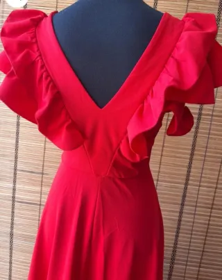 Vestido de estilo rociero en color rojo vibrante. Presenta un diseño con volantes en las mangas y escote en pico. - Color: Rojo - Diseño: Volantes en mangas y escote - Estilo: Bata rociera