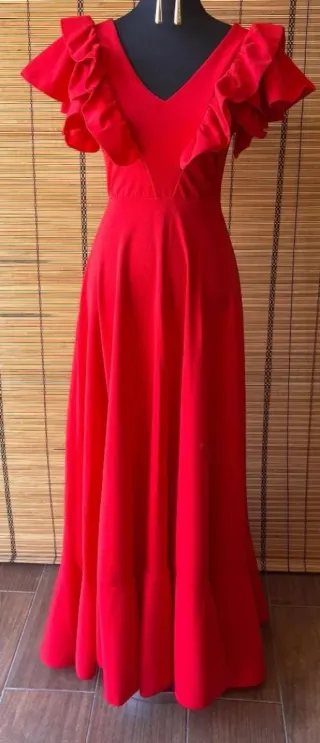 Elegante vestido de estilo flamenco, perfecto para ocasiones especiales. - Diseño largo con mangas acampanadas. - Detalle de volantes en cascada en la falda. - Cremallera oculta en la espalda.