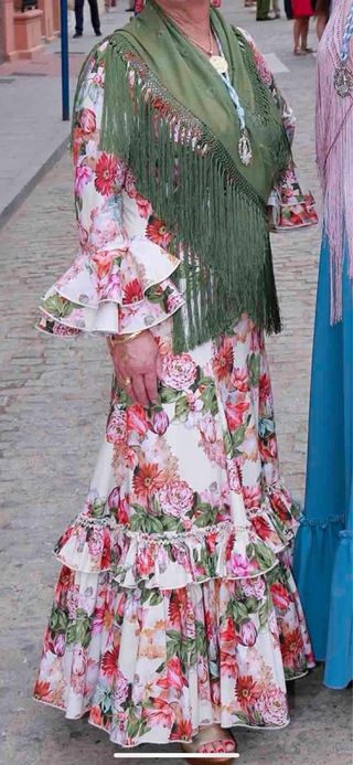 Vestido largo de estilo flamenco o de gitana, con un estampado floral vibrante. - Diseño con volantes escalonados en la falda. - Mangas al codo con volantes. - Escote cuadrado. REGALO MANTONCILLO A JUEGO HECHO Y FLECADO A MANO. Posibilidad de accesorios por 20€ más: (Flor, pendientes, collar, peineta)