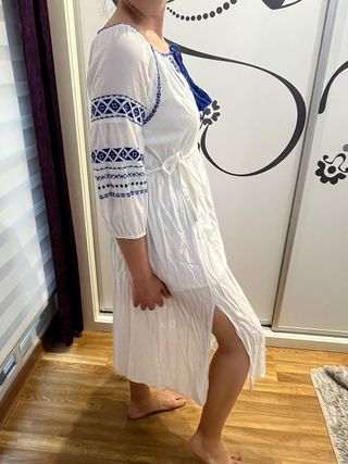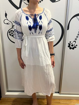 Precioso vestido veraniego de estilo griego, ideal para cualquier ocasión. Es una prenda bonita y elegante. - Diseño con bordados azules. - Cintura con lazo para ajustar. - Manga tres cuartos. En la foto sale arrugado, no me dio tiempo a plancharlo 😅 Tiene poquísimo uso