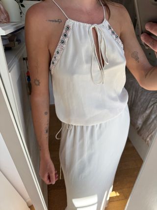 Precioso vestido largo de Zara en color blanco. Tiene detalles de perlas que le dan un toque elegante y estilo griego diosa griega y etnico. Es una prenda ideal para ocasiones especiales. Es una talla S, aunque es mejor para una M ya que talla grande . - Escote halter con abertura. - Diseño fluido y vaporoso. - Largo maxi.