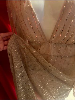 Elegante vestido largo con un diseño inspirado en el estilo griego. Su tejido está adornado con destellos dorados que le dan un toque brillante. Vaporoso con forro Gran escote y espalda descubierta Comodo de llevar incluso si utilizas una L ya que no es un vestido que deba llevarse ajustado todo lo contrario - Diseño largo y fluido. - Detalles de destellos dorados. - Corte estilo griego.
