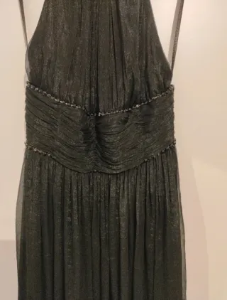 Elegante vestido de fiesta largo. - Diseño de corte imperio con detalles dorados debajo del pecho. - Escote halter. - Tejido fluido y ligero. - Estilo griego. - Largo hasta los pies. - Talla 40. Pero es realmente una 38. - Solo 1 puesta. Perfectamente conservado.