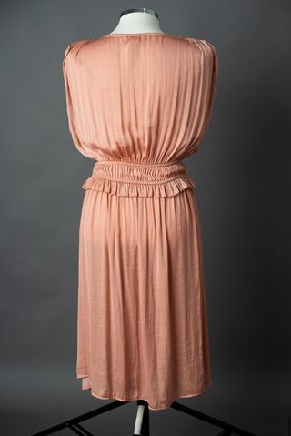 Vestido a la rodilla de tela tipo satén con un favorecedor escote en V y cinturón para ajustar a la cintura. Color rosa maquillaje. - Diseño drapeado en el cuerpo. - Cintura elástica con cordón. - Falda con vuelo.