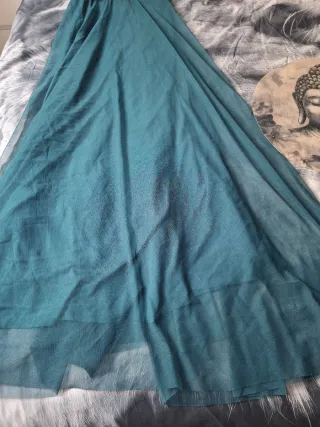 Vestido largo de graduación en color turquesa/azul verdoso, súper favorecedor y elegante. Tiene un diseño asimétrico de un solo hombro con capa de gasa vaporosa que cae sobre el brazo, dándole un toque muy fino y especial. - Tela ligera tipo gasa, con movimiento al caminar - Corte estilo griego que estiliza muchísimo la figura - Cintura marcada con banda decorativa en tono dorado/brillante - Falda suelta y fluida, muy cómoda Ideal para graduaciones, bodas, eventos o cenas especiales Está como nuevo, sólo se ha usado una vez. Talla M/38