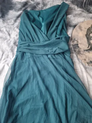 Vestido corte midi color verde aguamarina turquesa la parte de arriba es estilo griego teniendo los hombros unos detalles de bordados dorados súper bonitos atado con cremallera le puedes poner un cinturón finito o llevados sin cinturón a estrenar
