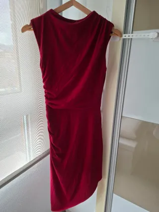 Vestido de color rojo vibrante con diseño de un solo hombro (estilo griego). Presenta un drapeado muy favorecedor en toda la silueta que ayuda a estilizar la figura y disimular la zona del abdomen. El tejido es elástico y cómodo, adaptándose muy bien al cuerpo. Ideal para eventos, cenas, graduaciones o una noche de fiesta. Corte asimétrico. Efecto fruncido/drapeado lateral y frontal. Largo por encima de la rodilla (mini/midi según altura). Solo se usó 1 vez para una boda.