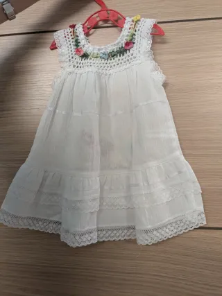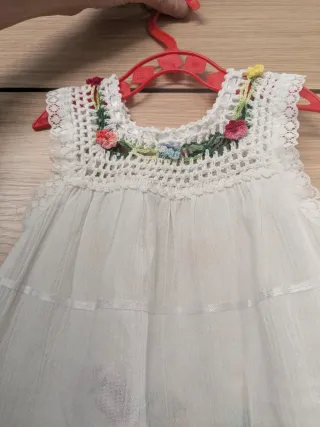 Precioso vestido de estilo ibicenco con detalles bordados. - Diseño blanco con bordados florales multicolor. - Tejido ligero y vaporoso. - Escote y mangas con detalles de crochet y puntilla. -Nuevo - Para niña de 1 año.