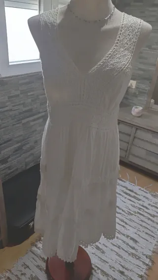 si escoges inpost para el envio te lo dejo en 10. Vestido blanco de estilo ibicenco, ideal para niñas de 4 a 6 años. Presenta un diseño con volantes y detalles de encaje. - Volantes escalonados. - Adornos de encaje en los bordes. - Tirantes finos.