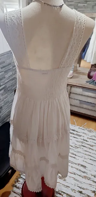 Vestido estilo ibicenco con un delicado encaje. - Diseño de tirantes. - Largo hasta la rodilla. - Acabado con puntilla en el bajo.