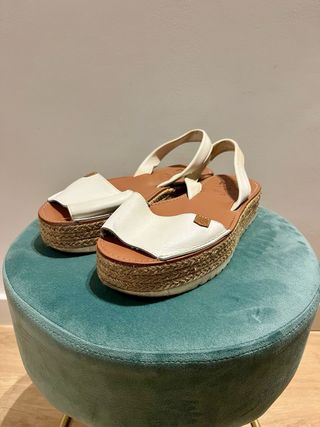 Menorquinas POPA de piel en color blanco con suela de esparto y base de goma, muy cómodas y estables. Diseño veraniego, fácil de combinar tanto con vestidos como con looks más casual. ✔️ Plataforma ligera ✔️ Piel suave ✔️ Muy cómodas para el día a día ✔️ Estilo mediterráneo / ibicenco Usadas en pocas ocasiones, en muy buen estado (ver fotos).