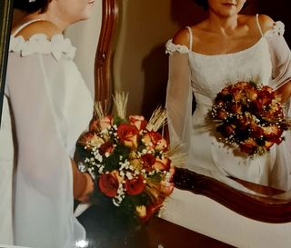 Estilo medieval, blanco roto, ligero, mangas de gasa hasta el suelo, la cola se recoge. Altura de la novia 1.53 + zapatos de tacón de 8cm. Ideal para boda civil. No lleva velo. Usado una sola vez. Talla 38-40.