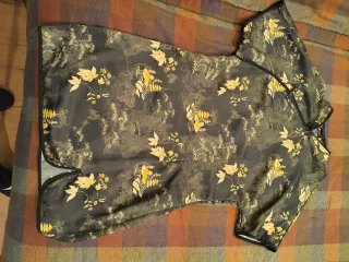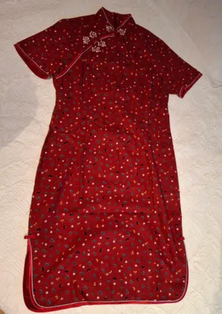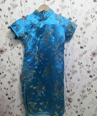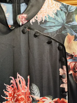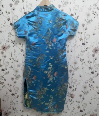Vestido de estilo oriental con un diseño llamativo. - Estampado floral y motivos tradicionales. - Cuello mao. - Manga corta. - Cierre lateral con botones. - Tejido satinado. Pone xxl pero le quedaria bien a alguien a partir de talla M