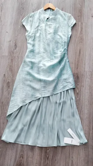 Elegante vestido para invitada con un diseño moderno y favorecedor, estilo oriental. - Corte asimétrico. - Tejido con textura sutil. - Falda con caída plisada. - Cremallera posterior - con etiquetas y bolsa original