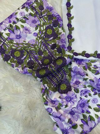 Tela con un hermoso estampado floral en tonos verdes y blancos, con detalles bordados que le dan un toque elegante. Ideal para confeccionar vestidos o prendas de inspiración oriental. - Diseño floral detallado. - Acabado con pedrería y bordado. - Fabricado en Indonesia.