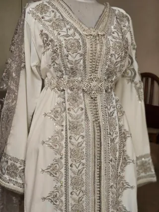 Elegante vestido de estilo oriental en color blanco, con detalles bordados en plateado. Ideal para ocasiones especiales con accesorios incluidos - Diseño con escote en V. - Cinturón a juego con pedrería. - Mangas largas con adornos. - Bordados florales y geométricos.