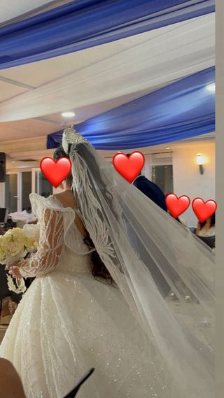 Elegante vestido de novia de estilo princesa, con un velo a juego. - Cuerpo del vestido con detalles de pedrería y encaje. - Falda voluminosa de tul. - Escote corazón con cuello alto de encaje. - Velo largo con borde adornado con perlas. mido 1,60,por detrás hace una pequeña cola. va con can can y guantes largos