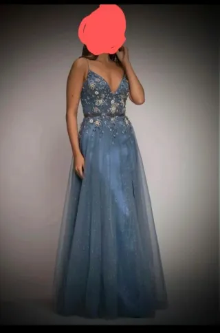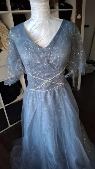 Vestido largo de tul con detalles brillantes, inspirado en el estilo de Cenicienta. Ideal para eventos especiales, cumpleaños de 15, fiesta, bodas o cualquier evento. Tiene 2 capas de tulle en un bello tono azulado y brillos. La parte de atrás se atra con una mezcla de cremallera y cintas que dejan una holgura entre 3 y 5 cm, en la espalda donde estan las cintas tiene una tela de refuerzo para mas comodidad,es muy cómodo de usar y ligero. Te sentirás como una princesa al usarlo. Talla pecho 135cm y 124cm cintura Precio negociable, se puede hacer pack con el otro vestido que tengo en mi perfil. Pregunta sin miedo