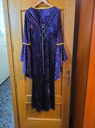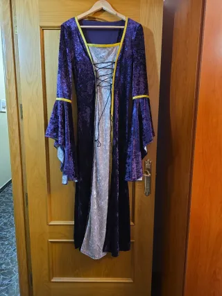 Vestido largo de estilo princesa medieval, ideal para eventos temáticos o disfraces. - Diseño con mangas acampanadas. - Detalle de cordones en la parte frontal. - Combinación de terciopelo morado y tela plateada. Un único uso. Hago envíos. Más disfraces en mi perfil.