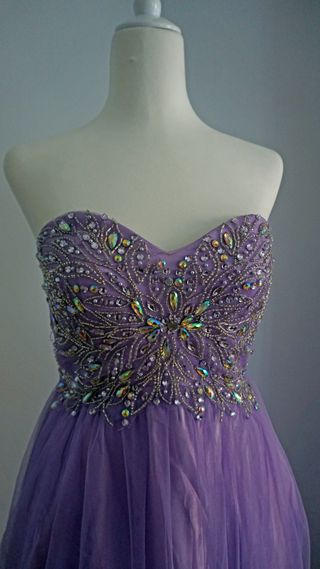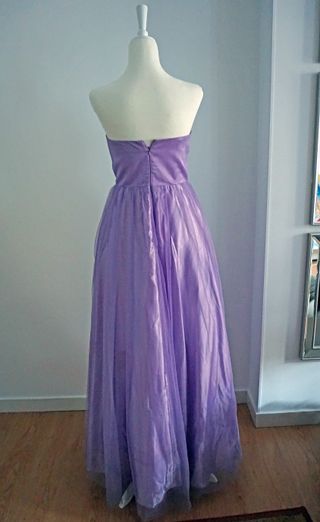 Vestido largo estilo princesa en color lila. - Diseño sin tirantes. - Falda vaporosa con varias capas de tela. - Cremallera en la espalda.