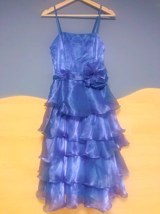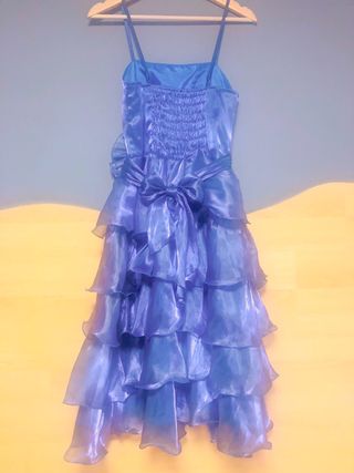 Vestido de fiesta con un diseño encantador y detalles que lo hacen especial. - Tejido irisado con un brillo sutil. - Estilo princesa con falda de volantes. - Adorno de flor en la cintura. - Lazada atrás. - Forro interior. - Tirantes ajustables. - Talla S/M Sólo envío por Correos.