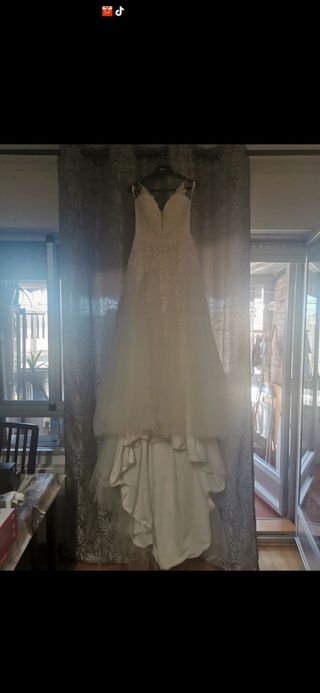 Elegante vestido de novia Pronovias con detalles de encaje. A parte del vestido incluye Sobrefalda de tull estilo princesa. 2 vestidos en 1. Incluye Can can para debajo del vestido El vestido está impecable. Las mangas son añadidas se podria modficar si gusta más sin mangas. Talla 34 36 - Diseño con escote ilusión y mangas largas. - Cuerpo ajustado con falda sirena. - Adornos de encaje floral en mangas y bajo. - Cierre con botones en la espalda. El único defecto que tiene es que los botones de la espalda los primeros se han descosido del tull pero se puede arreglar perfectamente,está valorado en 2800. El vestido es un espectaculo.