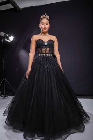 Ref. QM0120 Vestido negro, estilo princesa, de tul y corset. Apliques cinturón de brillo cocido, escote estilo corazón. En la parte trasera lleva un lazo de lateral esta cocido si desea se puede quitar. En alquiler 110€ Incluye can can y tintorería. Consultar condiciones. Contacta 693325170, también te ofrecemos el reportaje fotográfico.
