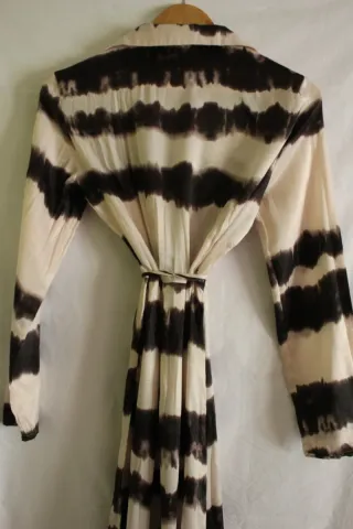 Kimono largo/vestido estilo boho estampado rayas horizontales tie-dye color crema y marrón. - Diseño cruzado con lazo en cintura. - Mangas largas. - Tela súper suave tipo seda satén.