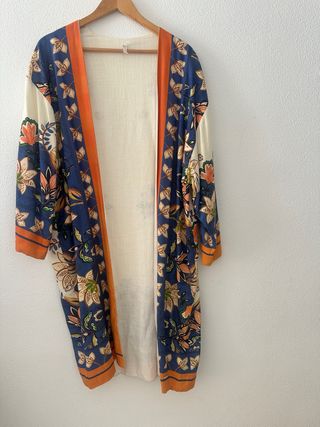 Kimono largo fluido con estampado floral boho en tonos azul, beige y naranja. Diseño abierto, muy favorecedor y ligero, ideal para verano, playa, viajes o looks relajados con vestido o vaqueros. Tejido natural y fresco, con mucha caída. Manga larga ancha y acabado decorativo en contraste. ✔️ Muy poco uso ✔️ En perfecto estado ✔️ Talla U (vale para S, M y L) ✔️ Composición: 100% lino ✔️ Marca: Sahoco