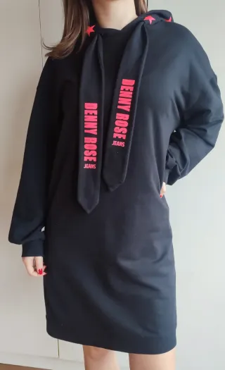 Vestido estilo sudadera de la marca Denny Rose. Presenta un diseño moderno con cordones en la capucha y detalles de estrellas. - Detalle de logo DENNY ROSE JEANS en los cordones. - Estrellas rojas decorativas en la capucha.